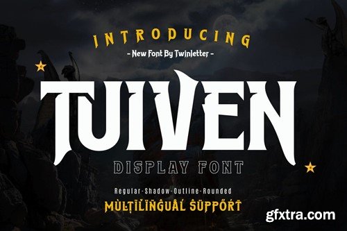 Tuiven is a typeface created specifically to add a dramatic and cinematic feel to design projects related to the world of film. This font combines elegance with boldness, creating an epic and soulful look. The letters in Tuiven have an artistic and strong design, with meticulous detail and crisp lines. Each letter creates a sense of boldness and elegance, giving a touch of luxury to the text used. This font is designed to be a highlight, giving a unique identity to a movie title, poster, or other design element. Tuiven's color palette tends to be serious and deep, creating a mysterious and dramatic feel befitting a serious or epic film genre. Despite this, this font still brings modern elements to maintain a balance between classic elegance and relevant aesthetics. Tuiven is suitable for use in film projects, trailers, or film promotions, where visual beauty and dramatic impact are appreciated. With a majestic appearance and full of character, this font exudes an aura of seriousness and professionalism, making it the perfect choice for capturing the audience's attention in a cinematic context. What’s Included: