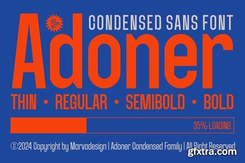 Introducing Adoner Condensed - the epitome of sleek, contemporary design in the world of typography. With its compact form and sans serif style, Adoner Condensed exudes confidence and sophistication, making it the perfect choice to attract attention and bring a modern feel to your designs. Suitable for "Titles With its boldness and clarity of character, Adoner Condensed provides a powerful presence in every title. From the cover page to the subhead, this font ensures your message is conveyed boldly and effectively" "Websites: Optimum readability and modern aesthetics make Adoner Condensed an ideal choice for website designs. Use this font in navigation, headings, or other large text to enhance branding and grab visitors' attention" "Posters: For stunning and effective posters, nothing beats the clarity and visual power of Condensed Adoner. With the ability to display large text in limited space, this font ensures your message is visible even from a distance" "Magazines: From cover layouts to editorial articles, Adoner Condensed brings an unmatched modern touch to your magazine designs. The compactness of the characters and the clarity of the lines make them perfect for capturing the reader's attention and creating a consistent professional impression" availlable
