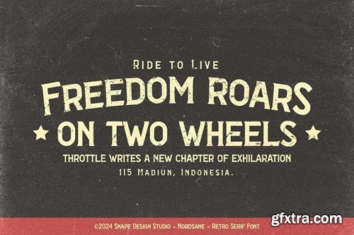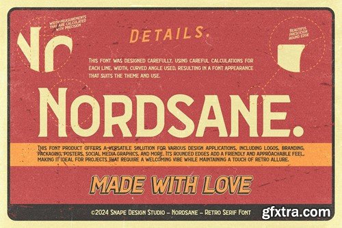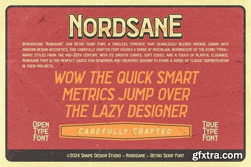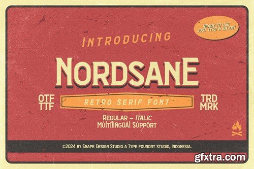 Nordsane, a retro serif font, captures the essence of mid-century typography with its timeless design. Inspired by vintage print materials, it blends distinctive serifs with clean lines for a classic yet captivating aesthetic. Versatile and stylish, Nordsane is perfect for branding, packaging, and editorial layouts, effortlessly adding a touch of nostalgia to any project. FEATURES : Uppercase, Lowercase, Number, Punctuation, Multilingual FAMILY FONT : Regular, Italic FILES INCLUDED : OTF File TTF File Regards, Snape Design Studio.
