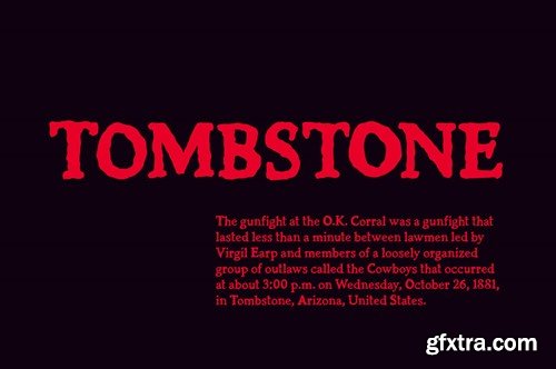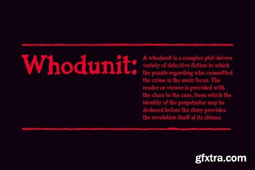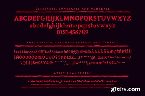 A Spine-Chilling Serif Font of Grotesque Horror Casket is a textured serif font that lives somewhere between the worn faces of long-forgotten gravestones, and the typewriters of gothic authors such as Bram Stoker and M.R. James - letters from a murder mystery with an ancient, ghostly tale to tell. Weighted and designed to work equally well as a display font and formal body text, this is a versatile choice that speaks of a literary past, with an aged textured that lends itself to themes of Horror, Whodunits and Westerns. The Casket font family includes a complete set of uppercase and lowercase characters, along with numerals, punctuation, symbols and language support. It also comes with a blood-soaked variant (for adding ghoulish details), each featuring a complete set of alternatives so you’ll never have to repeat characters, thus maintaining that all-important analogue look. Contents: