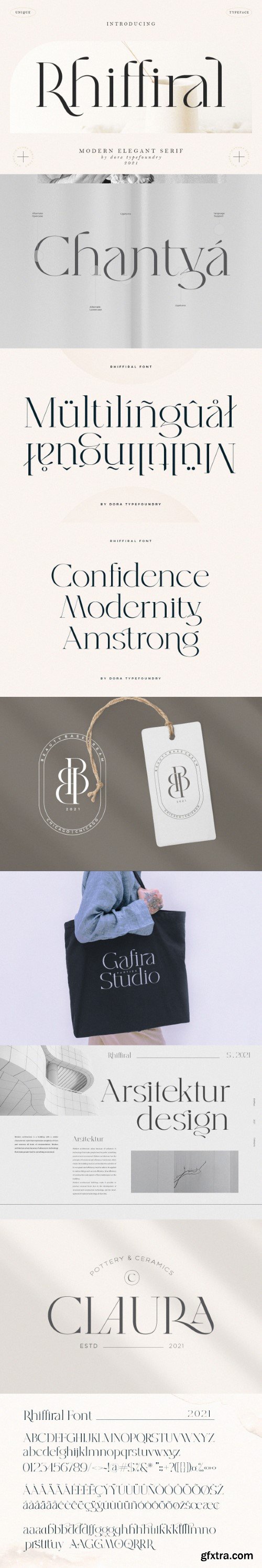 Rhiffiral is a serif font that can be applied to many graphic design projects or a classy editorial, a unique high contrast and light binding style for your upcoming projects. Use it for feminine logo signs, fashion & editorial design heads, branding projects, apparel branding, packaging, magazines titles, advertisements, T-shirts, postcards and other special occasions.