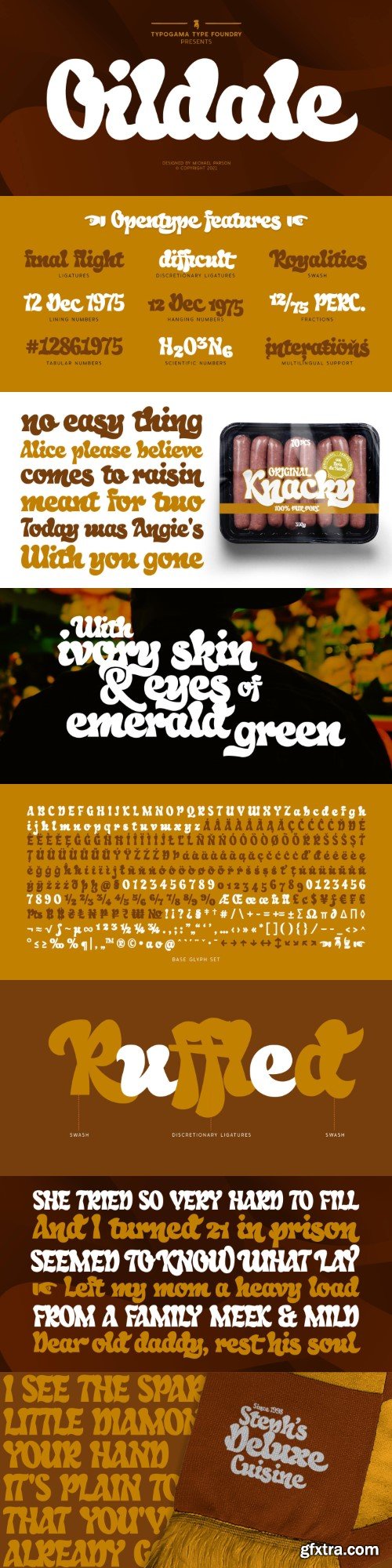 Oildale is a single weight, connecting script that explores the idea of using crossed strokes as the main body of the typeface. Designed as a display font, it’s bold form and unique appearance lend it a distinctive charm that can be used in branding, headlines or other titling. Featuring an extended Latin support covering a wide range of langages, it also includes a range of Opentype options, from a choice of numerals, ligatures or decorative, swash letters.
