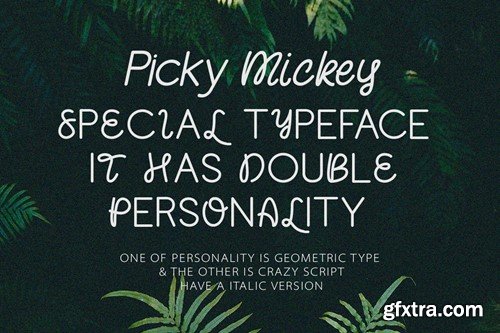 Picky Mickey is a rounded combination font duo. Sans serif typeface with crazy Script Typeface . But make this font look unique. Picky Mickey clean classic and mindful , it combine in one font, use this font for anything beauty place for your logo, headline, cover book, magazine and many more.