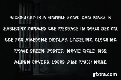 Proudly present our new product VICKY LORD Font VICKY LORD Font is a modern and authentic font. Perfect for both professional and branding needs of a product. This font is suitable for any branding project like quotes, logo, blog header, poster, banding, letter, invitation, stationery, etc... Designed as a versatile and flexible that can be used on a range of projects and mediums. outstanding in a wide range of contexts. Availlable otf ttf Uppercase If you have any queries, questions or issues please don't hesitate to contact us direct. Display and cover image Not include