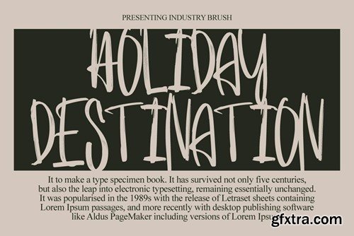 Industry Brush is a typeface with personality. You can use it as a logo, badge, insignia, packaging, headline, poster, etc The alternative characters in this font were divided into several OpenType features such as Stylistic Alternates, Stylistic Sets, and Ligature. The OpenType features can be accessed by using OpenType program such as Adobe Illustrator, Adobe Photoshop, and Adobe InDesign. Files included: Industry Brush.TTF Industry Brush.OTF Thank you!