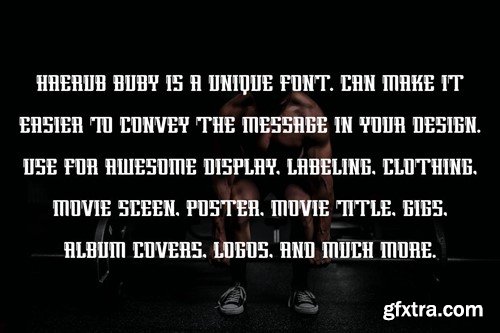 Haerub Buby is a unique font. Can make it easier to convey the message in your design. Use for awesome display, labeling, clothing, movie sceen, poster, movie title, gigs, album covers, logos, and much more. File Included