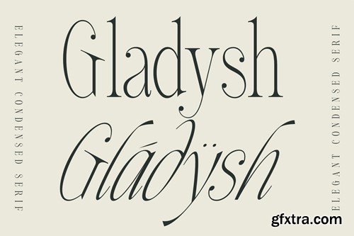 Introducing our latest font creation, a harmonious blend of elegance and boldness – Gladysh Elegant Condensed Serif Typeface. This unique font is meticulously crafted to cater to a diverse range of design needs, providing a versatile solution for both modern and classic projects. Key Features: Thin and Bold Styles: Strike the perfect balance between subtlety and prominence with our meticulously designed thin and bold variations. Whether you're crafting a sleek corporate logo or designing a minimalist poster, these styles offer the flexibility to express your creativity. Italic Grace: Elevate your design with the added touch of sophistication. The italic variations of ThinBold introduce a graceful slant, ideal for conveying a sense of movement, emphasis, and a touch of editorial flair. Perfect for fashion, editorial, or any project where a dynamic aesthetic is desired. Versatility in Application: From branding and advertising to web design and print materials, ThinBold Italic Typeface adapts seamlessly to various design contexts. Experiment with different weights and italics to achieve the visual impact you desire. Clean and Readable: Despite its stylish intricacies, ThinBold remains highly legible. Each character is meticulously crafted to ensure clarity and readability, making it an excellent choice for body text as well as headlines. Extensive Character Set: The font includes a comprehensive character set, encompassing a variety of accents and special characters to support multiple languages. This ensures that your design projects can maintain a consistent and professional look across diverse linguistic requirements. Elevate your design projects with the Gladysh Elegant Condensed Serif Typeface – where sophistication meets versatility. Download and incorporate this font into your toolkit for a sleek, contemporary, and dynamic visual identity.