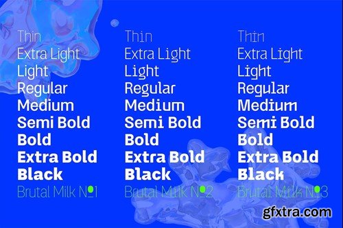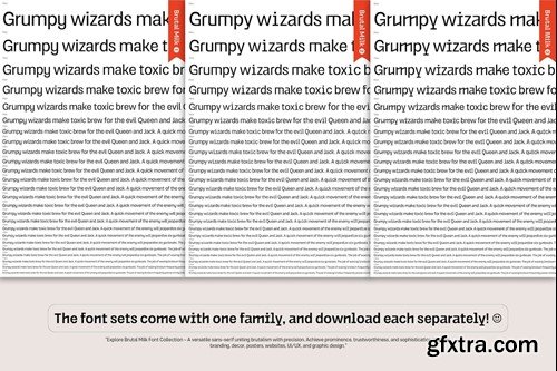 Introducing Brutal Milk Font Collection where prominence, trustworthiness, and sophistication converge. Brutal Milk is a captivating grotesque typeface that seamlessly blends the robust aesthetics of brutalism with the sleek sophistication of Swiss Design and the nostalgia of Y2K. This collection featuring three distinctive variants – Brutal Milk No1, Brutal Milk No2, and Brutal Milk No3 – offers a unique typographic journey for extraordinary design. Let's break down what we present in this work Brutal Milk No.1 | Modern Elegance with a Brutal Twist Aims for body text with the perfect balance of elegance and modernity. Brutal Milk No.1 is meticulously crafted for optimal readability, making it an ideal choice for a wide range of applications. Brutal Milk No.2 | Softened Brutalism for Approachable Headers Aims for display/header text with a gentle and approachable impression. Brutal Milk No.2 is crafted to add a touch of warmth to your designs, making it perfect for conveying a friendly and inviting tone. Brutal Milk No.3 | Rigid Rebellion for Prominent Headers Make a bold statement with headers that exude firmness. Brutal Milk No.3 is designed to capture attention with its rigid impression, injecting a sense of prominence and confidence into a visual identity. The Features The Brutal Milk Font Collection comes loaded with features such as case-sensitive forms, discretionary ligatures, ordinals, fractions, denominators, numerators, superscripts, and scientific inferiors – ensuring flexibility in design needs. Language Support From Western and Central European languages to South Eastern European, South American, Oceanian, and even Esperanto, Brutal Milk Collections caters to a diverse range of linguistic needs. File Compatibility: Brutal Milk Font Collection comes in a variety of formats, including; Variable font, .otf, .ttf, .woff, and .woff2 – ensuring seamless integration into the preferred platform. Brutal Milk stands as a testament to versatility and innovation. Whether you're crafting a sleek logo, establishing a brand identity, adorning decor, creating impactful posters, delivering compelling presentations, designing dynamic websites, refining UI/UX experiences, or engaging in graphic design endeavour. The impressions it imparts—modern, minimal, youthful, funky, groovy, trendy, hip, fly, and undeniably cool—speak volumes about its adaptability to contemporary design trends. Redefine the boundaries of creativity and immerse yourself in the dynamic world of Brutal.