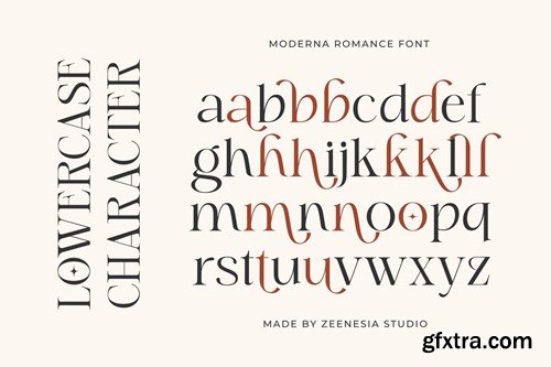 Introducing Moderna Romance. Moderna Romance is a beautiful and modern serif font created with a romantic and lovely look. It’s a very versatile font that works great in large. Whether you’re using it for business project, digital design, presentations, or making greeting cards, this font has the potential to become your favorite go-to font, no matter the occasion! We hope you enjoy the font, please feel free to comment if you have any thoughts or feedback. Thanks for purchasing and glad to help you!