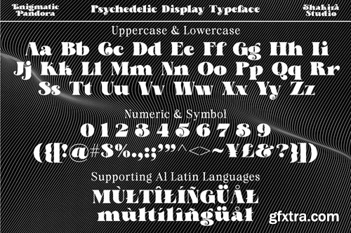 Say hello to new serif font, Enigmatic Pandora! Enigmatic Pandora is a serif font that combines a psychedelic uniqueness with bold boldness in each letter. With its eye-catching psychedelic characteristics, Enigmatic Pandora exudes an aura of mystery and magic that is hard to describe. Enigmatic Pandora offers a great typography experience with bold bold characters. Its bold and striking design makes each letter a centerpiece in the design. Combining stunning psychedelic elements with strong, compelling contours, this font provides a unique and compelling visual dimension. Enigmatic Pandora is suitable for use in design projects that want to express visual uniqueness and tension. This font is ideal for titles, posters, illustrations, album designs, and other creative projects that need an extraordinary and bold look. Here's what you get: Multilingual character supports : (Afrikaans, Albanian, Catalan, Croatian, Czech, Danish, Dutch, English, Estonian, Finnish, French, German, Hungarian, Icelandic, Italian, Lithuanian, Maltese, Norwegian, Polish, Portuguese, Slovenian, Spanish, Swedish, Turkish, Zulu) Follow my shop for upcoming updates, and for more of my work, Thank you!