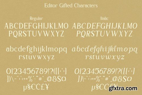 Say hello to the new classic nineties retro font, Editor Gifted! Editor Gifted - A classic nineties retro with a complementary italic version. In the italic family, we make it different from the regular and make a shape with a unique uppercase so it looks more classic, retro but a little modern We've also been loving combining the regular and italic, especially for logos and heading :D Included : Language Support: Danish, English, Estonian, Filipino, Finnish, French, Friulian, Galician, German, Gusii, Indonesian, Irish, Italian, Luxembourgish, Norwegian Bokmål, Norwegian Nynorsk, Nyankole, Oromo, Portuguese, Romansh, Rombo, Spanish, Swedish, Swiss-German, Uzbek (Latin) Thanks Pandeka Studio