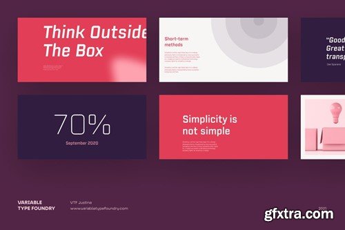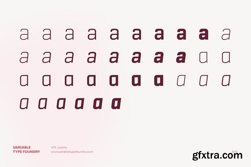 VTF Justina is a different typeface with a sans serif style that is inspired by geometric typographies to seek functionality and simple quality in any type of project. This very personal character of its forms together with the variety of eighteen weights with their respective italics (Thin, Extra Light, Ultra Light, Light, Regular, Semi Bold, Bold, Ultra Bold, and Black) it has makes it perfect to combine with the VTF Rozanova in digital projects (for example, web or applications) or printed (for example, corporate identity or packaging). Becoming a very interesting option for both large and small bodies without losing legibility in any weight. Justina has Opentype functions (Case sensitive forms, ordinals, scientific inferiors, denominators, superscripts, subscripts, numerators, fractions) designed exclusively for its design. Supports the following languages: Afrikaans, Albanian, Catalan, Croatian, Czech, Danish, Dutch, English, Estonian, Finnish, French, German, Hungarian, Icelandic, Italian, Latvian, Lithuanian, Maltese, Norwegian, Polish, Portuguese, Romanian, Slovak, Slovenian, Spanish, Swedish, Turkish and Zulu.