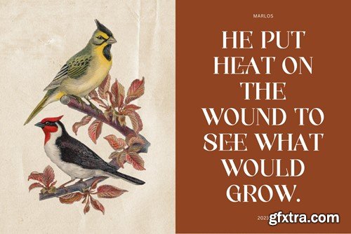 "Introducing 'Marlos,' a serif font that marries the elements of grace and boldness seamlessly. With its graceful serifs and commanding letterforms, 'Marlos' leaves a bold and lasting impression. Ideal for projects that demand a perfect balance between sophistication and impact, this font brings a touch of timeless elegance to your designs, making it a go-to choice for creating a powerful visual presence." Features: Thank you very much :)