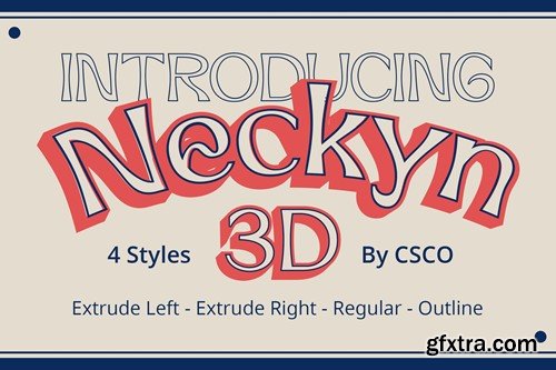 Neckyn 3D – A Trippy Extravaganza Dimensional Illusion Neckyn 3D is a dimensional illusion that brings your text to life. With a captivating 3D extrude effect, each character pops off the display. Artistic Outlines The font boasts artistic outlines that further enhance its 3D appearance, ensuring your text remains bold and eye-catching in any design context. Flowing Psychedelia Inspired by psychedelic art, Neckyn 3D features a myriad of flowing shapes, creating a visual journey reminiscent of a mind-bending trip through time and space. Conclusion In conclusion, Neckyn 3D isn’t just a font; it’s a psychedelic experience. Elevate your designs with this unique typeface, where every letter is a journey into the creative unknown, leaving a lasting impression on your audience. What you get : Neckyn Regular Neckyn Outline Neckyn Extrude Right Neckyn Extrude Left Features : Uppercase & Lowercase Numerals & Punctuations (OpenType Standard) Accents (Multilingual characters) PUA Encoded You can use this typeface without needing any specialized software. If you have any inquiries or need assistance, please feel free to contact us. We appreciate your support in enhancing your creative projects! Best regards, Craft Supply Co.