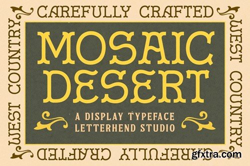 Introducing, Mosaic Dessertd! A Classic Wild West style font, ready to rock! Suitable for design needs with a touch of classic western and also suitable to be applied especially in logo, and the other various formal forms such as invitations, labels, logos, magazines, books, greeting / wedding cards, packaging, fashion, make up, stationery, novels, labels or any type of advertising purpose. Features : *Uppercase & lowercase *Numbers and punctuation *Alternates/Ligatures *Multilingual *PUA encoded We highly recommend using a program that supports OpenType features and Glyphs panels like many of Adobe apps and Corel Draw, so you can see and access all Glyph variations.