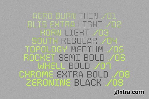 Fonts family that carries 9 weights, inspired by robotic technology. These fonts are very unique with smooth curves and very careful attention to the details of the connections between the blocks. These fonts are very suitable for making logos or titles on packaging and websites or even for use on social media. FILES FORMAT : OTF and TTF _