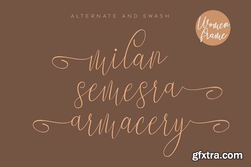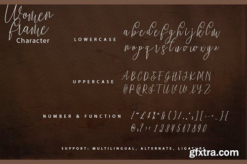 Women frame si baeutyful script font. The shape is modern and unique and the writing style is very natural. You can create many beautiful typographic designs with this font. Add to your most creative ideas and watch how they bring them to life! Including: Thanks