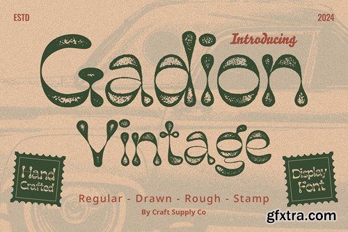 Gadion Vintage: Timeless Charm in Every Bubble Nostalgic Bubble Design Gadion Vintage, a captivating display font, transports you back in time with its charming bubble-shaped letters, reminiscent of retro aesthetics. Stamped and Rough Elegance Each character carries the distinctive stamp and rough texture, adding an authentic vintage touch. Gadion Vintage doesn’t just mimic the past; it embraces its imperfections for an effortlessly elegant look. Eye-Catching Vintage Appeal The font’s unique blend of bubble design, stamp effect, and rough detailing creates an eye-catching vintage appeal. It’s not just a font; it’s a statement that demands attention. Conclusion Gadion Vintage isn’t merely a font; it’s a journey through time. With its bubble design, stamped elegance, and vintage appeal, this font seamlessly combines the old and the new, ensuring your designs stand out with timeless charm. What you get : Gadion Regular Gadion Drawn Gadion Rough Gadion Stamp Features : Uppercase and lowercase characters Numerals and Punctuation (OpenType Standard) Accents (Supports Multilingual Characters) PUA Encoded No specialized software is needed to utilize this typeface. For any inquiries or assistance, please don’t hesitate to get in touch. We appreciate your support in making your creative projects shine! Best regards, Craft Supply Co.