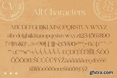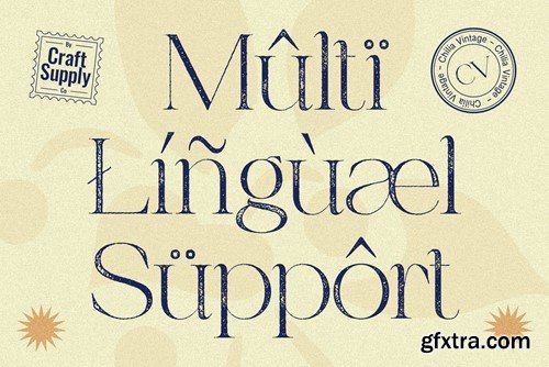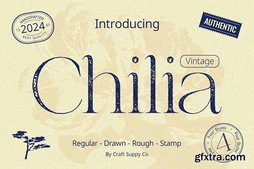 Chilia Vintage Font: Nostalgic Charm in Every Stroke Vintage Allure Chilia Vintage, a serif display font, takes you on a journey back in time with its distinct stamp and rough effects. Rugged Sophistication The font exudes a rugged sophistication, making it ideal for projects that require a touch of vintage charm. The stamp effect adds a raw, authentic quality to each character. Eye-Catching Appeal Chilia Vintage doesn’t just stop at vintage; it goes a step further with eye-catching details. The carefully crafted rough edges create a unique aesthetic, ensuring your design stands out. Conclusion Chilia Vintage is more than a font; it’s a testament to the enduring appeal of vintage design. Immerse your projects in the nostalgic charm of Chilia Vintage, where every stroke tells a story of bygone eras. What you get : Cenios Regular Cenios Drawn Cenios Rough Cenios Stamp Features : Uppercase and lowercase characters Numerals and Punctuation (OpenType Standard) Accents (Supports Multilingual Characters) PUA Encoded No specialized software is needed to utilize this typeface. For any inquiries or assistance, please don’t hesitate to get in touch. We appreciate your support in making your creative projects shine! Best regards, Craft Supply Co.