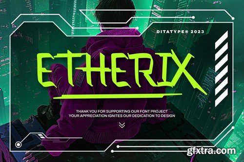 Etherix is a captivating display font. With its futuristic style and urban vibes, Etherix captures the spirit of modern city life, making it perfect to convey a sense of urban coolness and contemporary style. At its core, Etherix featuring sharp lines, geometric shapes, and sleek curves that evoke a sense of innovation and progress. The quite large weight of the font adds a boldness that demands attention. What sets Etherix apart is its uneven outline, which adds an element of rawness and dynamism to the font. This irregularity in the outline gives each character a unique and edgy appearance, reminiscent of the vibrant energy found in urban landscapes and street art. In addition, enjoy the features here. Features: Included: Etherix fits in headlines, logos, posters, flyers, technology branding, sci-fi book covers, futuristic UI/UX design, editorial layouts, and many more designs. Find out more ways to use this font by taking a look at the font preview. Thanks for purchasing our fonts. Hopefully, you have a great time using our font. Feel free to contact us anytime for further information or when you have trouble with the font. Thanks a lot and happy designing.