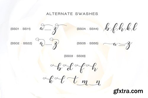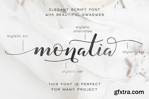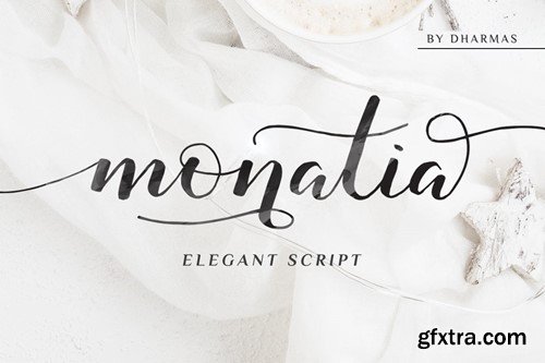 Introducing the elegant new Monatia Elegant Script! For those of you who need a touch of elegance and modernity for your designs, this font was created for you! Monatia was built with OpenType features and includes beginning and ending swashes, alternate swash characters for most lowercase letters, numbers, punctuation, alternates, and ligatures and it also supports other languages :) This font has given PUA unicode (specially coded fonts). Files Included : If you've got any questions feel free to leave a comment or send me a message. Thank you