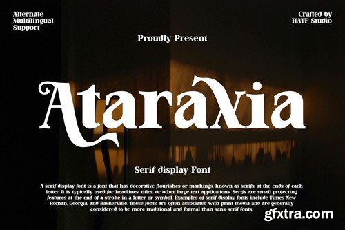 Ataraxia is a serif display font. A typeface designed to give text an elegant and formal appearance. This font is characterized by the presence of serifs, which are small additional parts that stand out at the ends of the letters. These serifs add a classic and traditional impression to the text, and help clarify reading, especially in large text sizes. Serif display fonts often have an elegant and detailed character, with smooth lines and well-proportioned letterforms. With its elegance, serif display fonts are suitable for titles, headers or main text in graphic designs that prioritize a formal and classy impression. Feature :