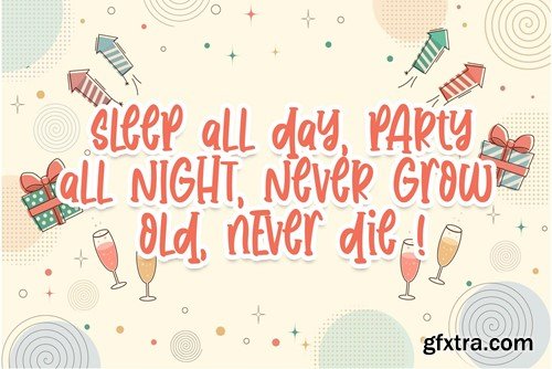 Elevate your designs with the festive and dynamic vibes of the Sunday Party Font. Inspired by the joyous atmosphere of Sunday celebrations, this font adds a playful and lively touch to your projects. Ideal for invitations, banners, posters, and more, the Sunday Party Font is designed to bring a sense of excitement and fun to your creative endeavors. Features: Festive and Dynamic Style: The Sunday Party Font exudes a festive and dynamic aesthetic, capturing the spirit of lively celebrations. Its playful letterforms are perfect for conveying a sense of joy and enthusiasm in your designs. Multiple File Formats: