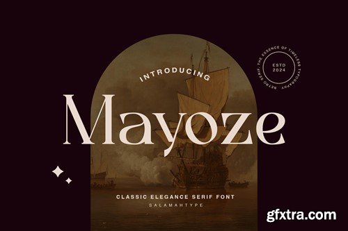 "Mayoze" font is a type of serif font that embodies classic and elegant values. This font will appear beautifully from every unique angle and is generally suitable for logos, posters, magazines, product packaging, and any design requiring an elegant touch. The font comes equipped with multilingual support in OTF, TTF, and WOFF formats. Features: