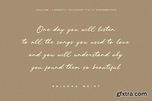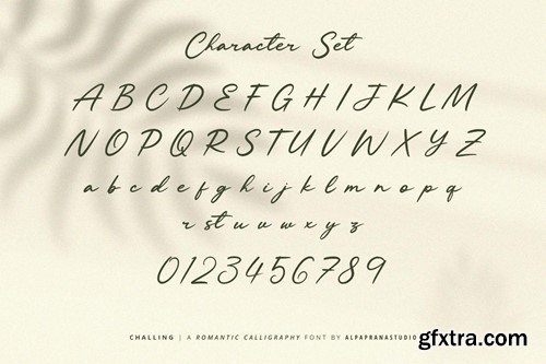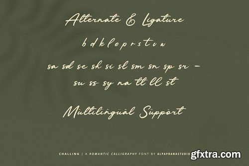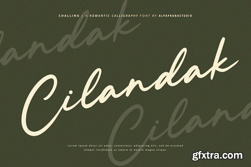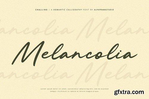 Challing is a romantic calligraphy font with natural and modern feels. Product Content : Features : I hope you enjoy this font. If you have any questions please don't hesitate to drop me a message :) Best, Alpaprana
