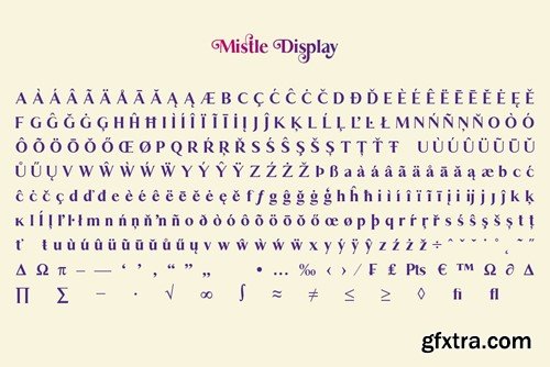 Mistle Bold is a serif display font that has a classic, feminine and elegant style. Included 3 Fonts, upright and slant. OpenType features allow for the implementation of typographic such as ligatures and multiple language support. Good choice for branding, magazines, posters, advertising, print, packaging, headlines, web design etc.