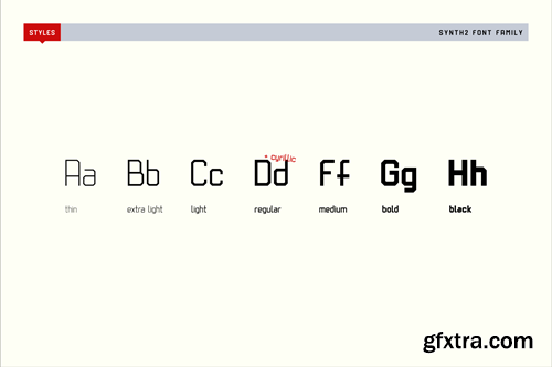 The font has a truly futuristic nature. It perfectly conveys the atmosphere of technology and futurism and it's the best choice for sci-fi and hi-tech topics and pictures. The font letters are unrounded, its build is consistent and straight. The font includes 7 styles: thin, extra light, light, regular, medium, bold, and black. With the variety of font widths, there is the ability to make different combinations in graphic or web design projects as well. Carefully kerned letters look good in paragraphs and titles. Special attention to uppercase headings. Synth2 Regular supports Cyrillic. The font counts 477 glyphs for each style. The thin style is free to use. Formats included: TTF, WOFF, WOFF2