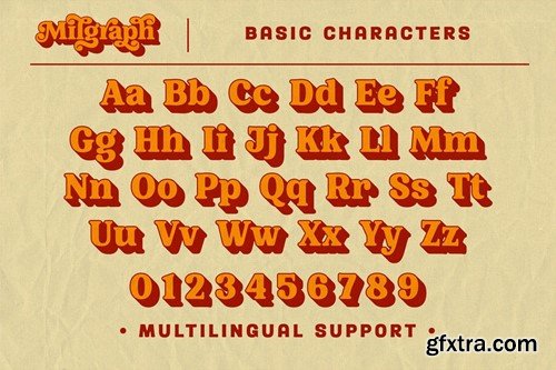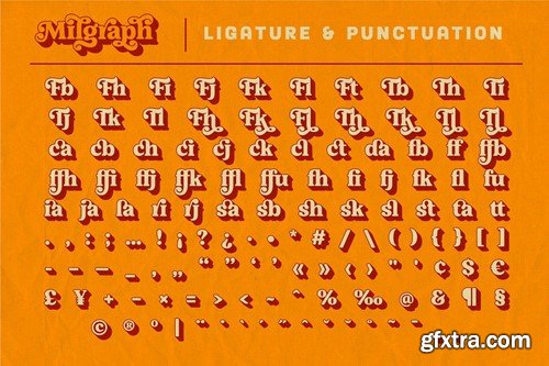Introducing Milgraph, A Retro Serif font. It was inspired by retro typography designs in 70's. There are more than 550+ glyphs in this font including Multilanguage Support. OpenType features with Stylistic Alternates, Contextual Alternate, ligatures and terminal letter in some characters that allows you to mix and match pairs of letters to fit your design. Milgraph also comes with Extrude Font version, so you can giving a unique retro touch to your digital projects in ease. Milgraph is perfectly suitable for made to be applied especially in logo, and the other various formal forms such as invitations, labels, logos, magazines, books, greeting / wedding cards, packaging, fashion, make up, stationery, novels, labels or any type of advertising purpose. Files Include: Thank You very much, hope you enjoy this fonts !