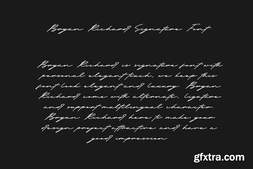Bryan Richard is signature font with elegant and luxury sense. Bryan Richard bring trend of stylish brand to signature visual font to make brand more stand out and eye catch. We keep this font look fashionable, luxury, elegant, classy and stylish. Bryan Richard is perfectly choice for any creative endeavor, chic, lifestyle design such as logos, title, watermark on photography, cover, branding, display and magazine, wedding event, corporate brand, quotes, album cover, business card, business project and many other design project with handwritten taste. What you have: Fonts include multilingual support for: Afrikaans, Albanian, Asu, Basque, Bemba, Bena, Breton, Chiga, Cornish, Dutch, English, Estonian, Filipino, Finnish, Friulian, Galician, Gusii, Indonesian, Irish, Italian, Kabuverdianu, Kalenjin, Kinyarwanda, Luo, Luxembourgish, Luyia, Machame, Makhuwa-Meetto, Makonde, Malagasy, Manx, Morisyen, North, Ndebele, Nyankole, Oromo, Portuguese, Quechua, Romansh, Rombo, Rundi, Rwa, Samburu, Sango, Sangu, Scottish, Gaelic, Sena, Shambala, Shona, Soga, Somali, Spanish, Swahili, Swedish, Swiss, German. Thank you for your purchase! Hope you enjoy with our font!