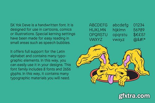 SK Yok Deve is a handwritten font. It is designed for use in cartoons, comics or illustrations. Special kerning settings have been made for easy reading in small areas such as speech bubbles. It offers full support for the Latin alphabet and contains many typographic elements. In this way, you can easily use it in your designs. This font family includes 8 fonts and 2656 glyphs. In this way, it contains many typographic materials you will need.