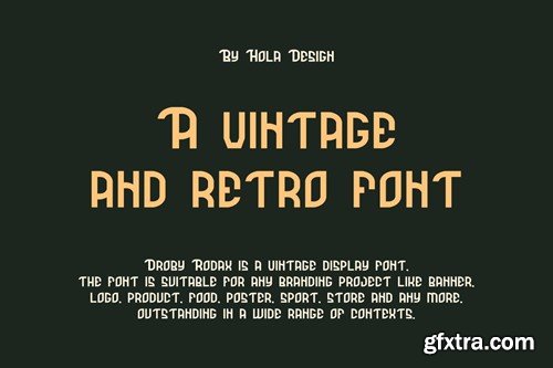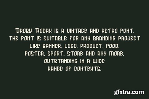 Droby Rodax - Vintage & Retro Display Font Font is unique . Ready to use for your design like labeling, movie sceen, poster, movie title, gigs, album covers, logos, and much more. Included