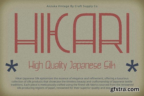 Anzuka Vintage: A Tribute to Art Deco Elegance Geometric Display Design Anzuka Vintage boasts a striking geometric display design, drawing inspiration from the iconic Art Deco movement. Its clean lines and bold shapes capture the essence of the era. Vintage Effect The font is enhanced with a vintage effect, giving it a timeless appeal reminiscent of the past. With its stamp, drawn, and rough textures, Anzuka Vintage exudes character and authenticity. Art Deco Inspiration Drawing from the golden age of design, This font pays homage to the Art Deco movement with its intricate details and geometric patterns. Each character reflects the elegance and sophistication of the era. Versatile Application Despite its vintage-inspired design, This font is versatile in its application. Whether used for branding, packaging, posters, or signage, it adds a touch of retro charm to any project. Timeless Elegance with a Retro Twist This font combines the geometric precision of Art Deco with vintage-inspired textures to create a font that is both elegant and nostalgic. Its versatility and classic appeal make it a valuable asset for designers seeking to evoke the glamour of yesteryears in their projects What you get : Features : For any inquiries or assistance, please don’t hesitate to get in touch. We appreciate your support in making your creative projects shine! Best regards, Craft Supply Co.