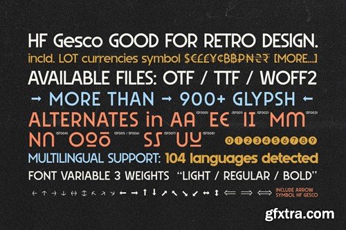 HF Gesco is a variable font with 3 weights, Light, Regular and Bold, a sans serif font inspired by 90s style music posters and album covers. The Gesco font has 967 glyphs, supports almost 100 languages and is equipped with number symbols such as superior numbers and inferior numbers, as well as circular numbers. Apart from that, HF Gesco also has arrow characters that can sharpen your design. You also find alternative characters as choices for the letters A, E, I, O, M, N, S, and U. This retro style font is suitable for poster designs, online magazines, headlines, logo types, and etc. What you get: Features: