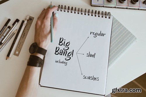 Big Bang! Cute Sans with Additional Swashes Introducing the elegant "Big Bang!" Cute Sans with Additional Swashes If you are needing a touch of funnies chic cute sans for your designs, this font was created for you! What's Included: Big Bang (TTF + OTF) Big Bang / Slant (TTF + OTF) Big Bang / Swashes (TTF + OTF) Big Bang was built with OpenType features cute characters for uppercase and lowercase letters, loads of different swash character for numerical, uppercase and lowercase letters in file with the name Big Bang Swashes, in other side for Bing Bang regular and slant version include numbers, punctuation, ligatures and it also supports other languages :) Accessing the swashes / opentype features / glyphs: This font works best in a program that supports OpenType features such as Adobe Indesign, Adobe Illustrator CS, or Adobe Photoshop CC. You can access the swashes and alternates from the 'Glyphs Panel' in these programs. Cheers!