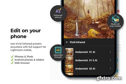 Step into a world beyond reality with these Vivid Infrared Lightroom presets and LUTs. They seamlessly transform your landscape photos into ethereal, otherworldy scene. From red forests to golden jungles, these presets don't just replicate infrared films like Aerochrome, they also create entirely new styles. With these presets, you'll be able to reimagine your landscape photos and immerse your audience in a visual journey like no other. Download Contents: 20 Lightroom Desktop & Mobile Presets 20 Skin Tone Protected Presets 20 LUTs 20 Skin Tone Protected LUTs Lightroom Presets (with AI): ✔️ AI-powered Lightroom presets for more dynamic results ✔️ Supports Lightroom on mobile, desktop, and the web ✔️ Supports Lightroom's slider to adjust the profile amount LUTs: ✔️ 3DL, CUBE, MGA, and PNG files included ✔️ No banding or artifacting and passes stress testing. Enhancements: ⭐ VOXCOLOR Skin Tone Protection - Ensure natural-looking portraits by protecting skin tones ⭐ VOXCOLOR SmoothTones - Professional results with smooth tonal and color transitions Compatible With: Lightroom Presets: Lightroom CC 2023+, Lightroom Classic CC 2023+, Lightroom Mobile, Photoshop CC 2023+, Adobe Camera Raw v15+ LUTs: Affinity Photo, Premiere Pro 22.0+, Final Cut Pro v10.4+, DaVinci Resolve, Avid Media Composer, Cyberlink ColorDirector, OBS Studio, Vegas Pro, Spark AR Studio, Nuke, Filmora