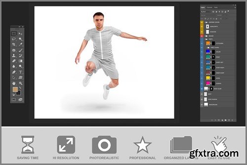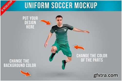 A Soccer Player in Uniform Jumping Mockup helps you to apply your amazing designs. Are made in such a way that you can easily add your artwork using the provided layers, precise masks and special smart objects. Just drag and drop it to a Smart Object. It’s incredibly simple to use. The template is made in such a way that you can easily change the color of your individual parts. And to add your artwork using the provided layers, precise masks and special smart objects. Allow you to customize the entire look of the kit. The high resolution of this mockup (4.000 x 5.500 pixels) allows it to be used for commercial purposes. Replace invaluable time and expensive photosessions with this mock-up to get what you need in minutes. Highly detailed and incredibly simple to use. Handy for professional commercial and also freelance or even personal presentations. View the product screenshots for more details. Enjoy the outstanding quality!