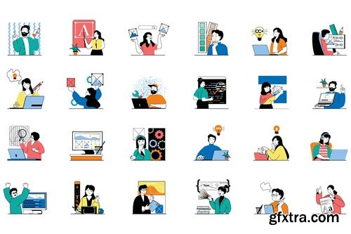 Designer agency concept with character situations mega set. Collection of scenes people creating art projects and branding, making logos, selecting colors palette. Vector illustrations in flat web design. ZIP files Includes: