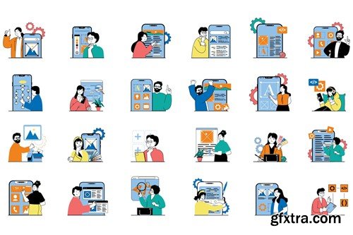 App development concept with character situations mega set. Collection of scenes people programming and coding, engineering application, releasing new product. Vector illustrations in flat web design. ZIP files Includes: