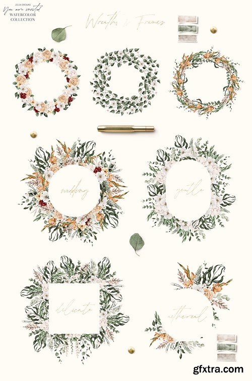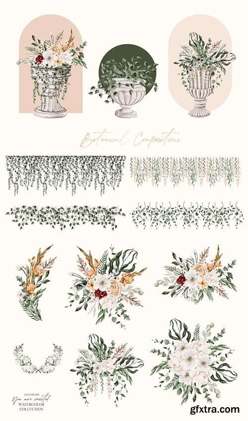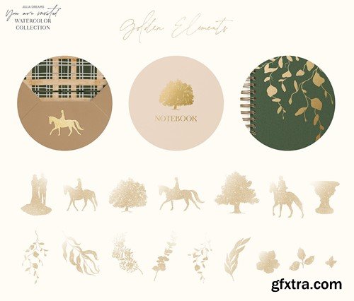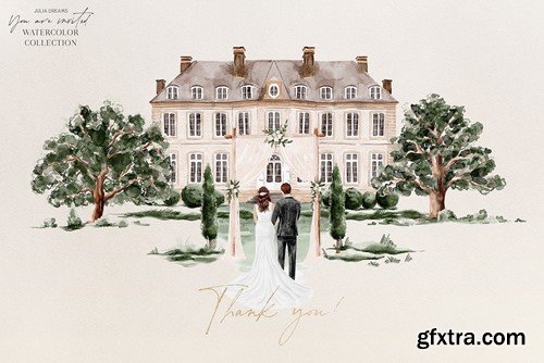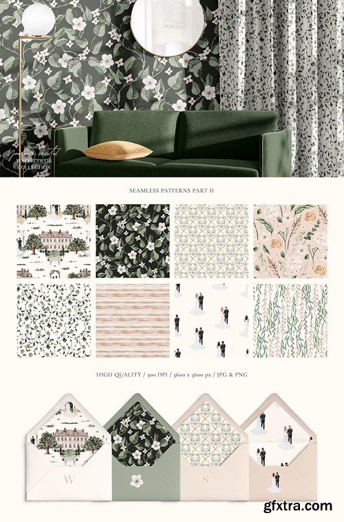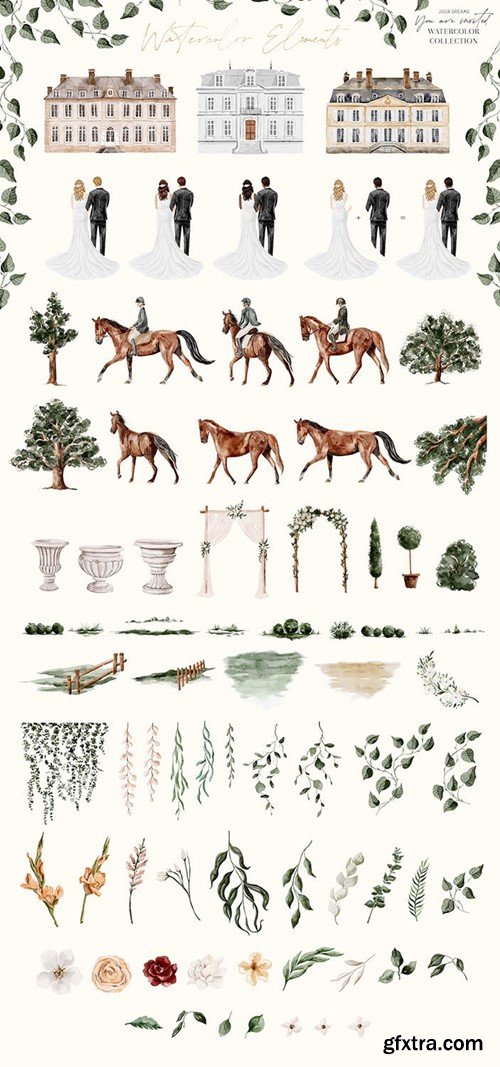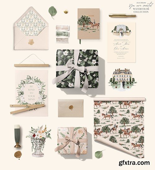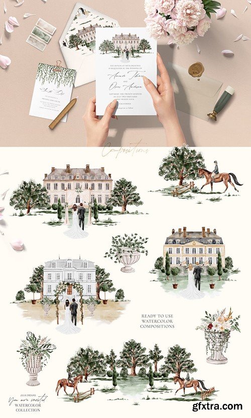 You Are Invited is a collection of tender and absolutely glorious watercolor elements. Hand painted with love watercolor elements can perfectly complement your project and help create a sophisticated, restrained and fashionable style. This collection includes watercolor illustrations of the manor house, equestrian, bride and groom, and more. This collection was carefully crafted and great attention was paid to details. It consists of different pre-made elements and seamless patterns that can be used individually or combined with other elements. Use ready-to-use elements and patterns or create your own individual product using all these elements. WHAT’S INCLUDED: • 81 watercolor elements - png with transparent background; • 16 seamless patterns - jpg and png with transparent background; • 5 compositions - png with transparent background; • 13 botanical compositions - png with transparent background; • 5 decorative elements - png with transparent background; • 16 gold elements - png with transparent background; • 7 wreaths - png with transparent background;