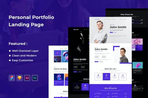 **Personal Portfolio Landing Page** This template is simple but yet professional and modern website. You can edit it in Figma, Adobe XD, SKETCH, and Adobe Photoshop. Easy to insert your content, change the colors, all the templates are included and ready to be shared with your audience. All components are vector basaed, fully compatible, editable and pixel perfect. Also, they are well-organized, carefully named and grouped.