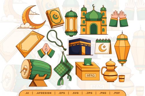 Illustration clip art collection featuring Islamic elements, including mosques, crescents, stars, Quran, prayer mats, minarets, ketupat, drums, lanterns, Kaaba, etc. Perfect for Ramadan, Eid al-Adha, and any Islamic-related project