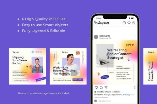 Craft a stunning Instagram post effortlessly for your career development services with this PSD template. It's designed for quick and easy customization, allowing you to change text, colors, shapes, and images seamlessly. Elevate your professional services with an elegant and eye-catching design.