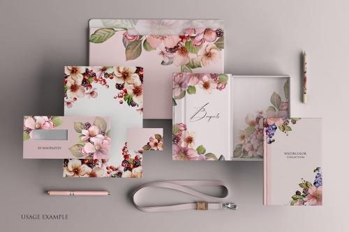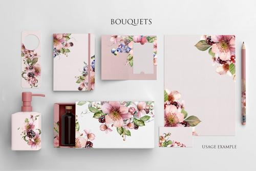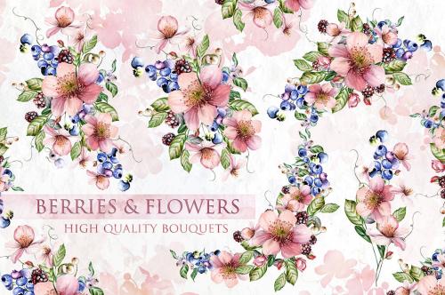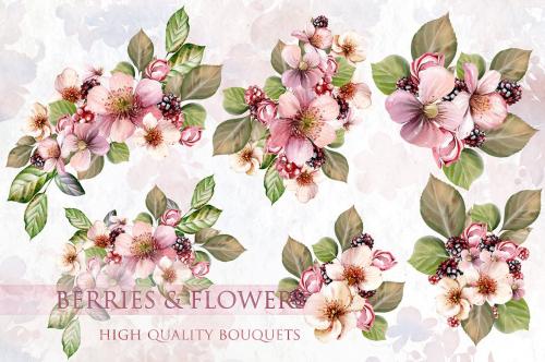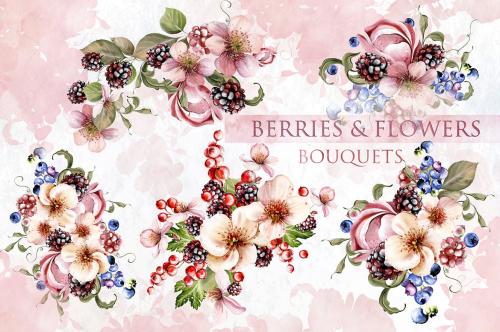 Hand painted watercolor 21 BOUQUETS with berries and flowers