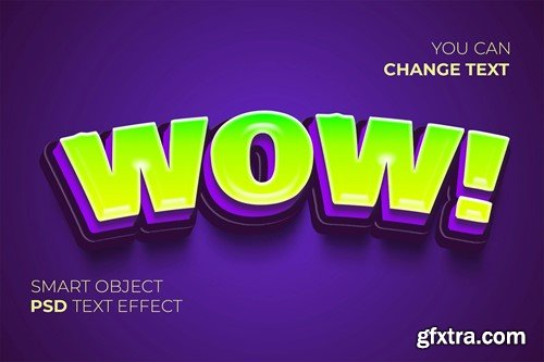 Editable text effect with Wow cartoon word in green and purple color. 3d design creative font with 70s comic style bold letters of smart object. Customizable typography template with title typeset. Features: Zip Included: