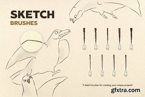 Scattering the paint dots in the chaotic order is what you have 10 spray brushes for. Shading and hatching is the 10 hatch brushes responsibility — those forms and volumes won't be created themselves, you know. For quick drawings, your hand will reach for 9 sketch brushes in the set, carried out with different kinds of intensity. Last but not least, 31 texture brushes, repeating various eccentric forms you might use for some artistic reasons of your own. Add there 10 grunge textures we've prudently included in the pack, and you've got yourself the irreplaceable collection, able to deal with all design intentions. What's inside?