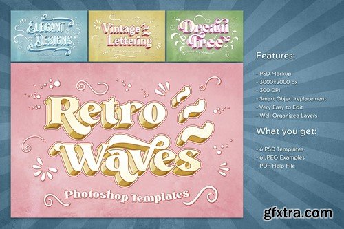 You can use these 4 Photoshop templates for making cool retro lettering for posters, social media, video titles, Instagram, promo, ads and more! Bring a touch of nostalgic charm to your designs with our Retro Vintage Text Effects. This collection includes 4 high-quality PSD templates, each offering a unique and colorful text with vintage ornaments. 4 PSD Templates: Each template is meticulously crafted to deliver elegant lettering compositions that stand out. Enjoy stunning detail with a resolution of 3000×2000 pixels at 300 DPI, perfect for both digital and print projects. Customizing your text is a breeze with smart objects, allowing you to quickly change the text while retaining the intricate effects. Free Fonts Included. All templates use free fonts, ensuring you can easily match the exact look and feel without additional cost. Transform your projects with the timeless appeal of retro vintage aesthetics, made effortlessly accessible with our easy-to-use text effects. Works with anything: Features: What you get: How to change the text via smart object: https://youtu.be/rt2LEb7qZaE